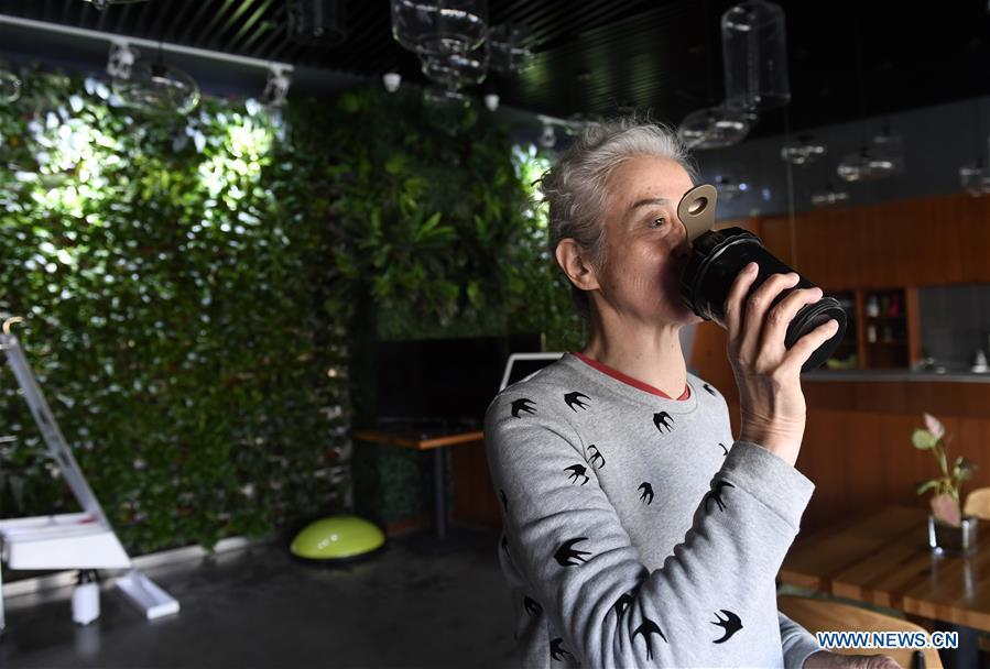 Bai Jinqin, a 74-year-old bodybuilding adept, relaxes after exercising at a gym in north China's Tianjin, March 13, 2019. Bai has kept exercising for 14 years. After finishing her housework, Bai likes to spend one hour every day at the gym to build her body. The hobby has rewarded her with good physique and energy. (Xinhua/Yue Yuewei)