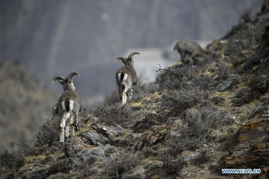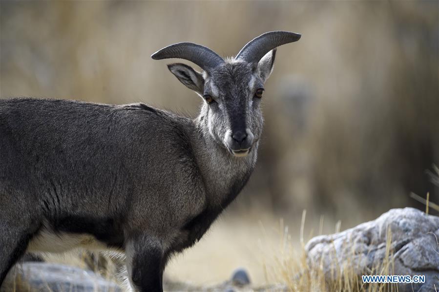 Bharal, also called the Himalayan Blue sheep, is seen at the Helan Mountain National Nature Reserve in northwest China's Ningxia Hui Autonomous Region, March 27, 2019. The number of bharal has reached over 40,000 on the Helan Mountain after years of environment renovation. (Xinhua/Feng Kaihua)