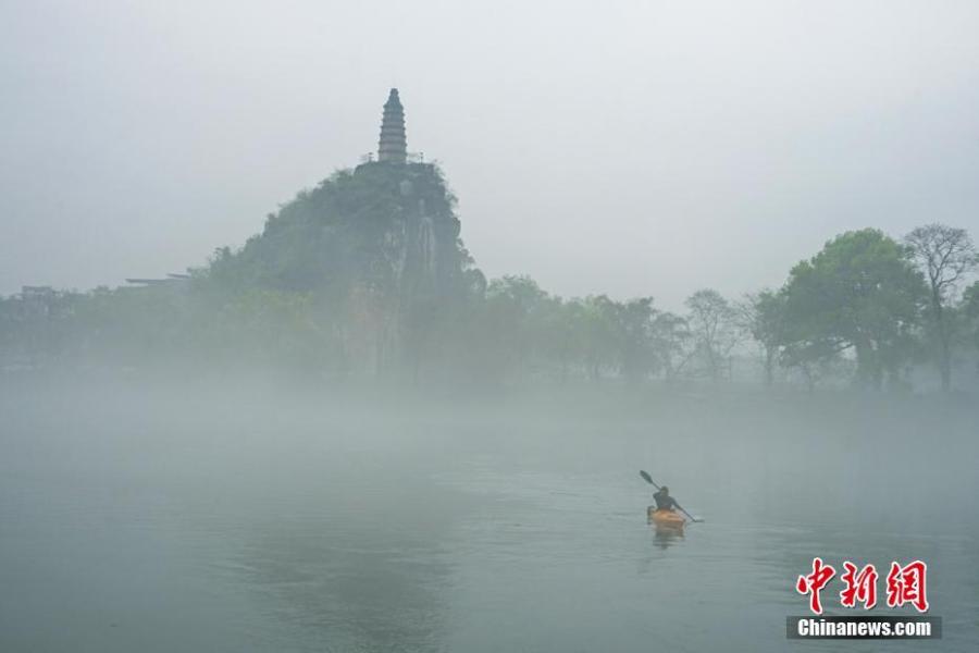 Downtown Guilin City covered in mist in Guangxi Zhuang Autonomous Region, March 28, 2019. Like a green ribbon flowing through the mountains, the Lijiang River is known for its amazing natural beauty. (Photo: China News Service/Tang Mengxian)