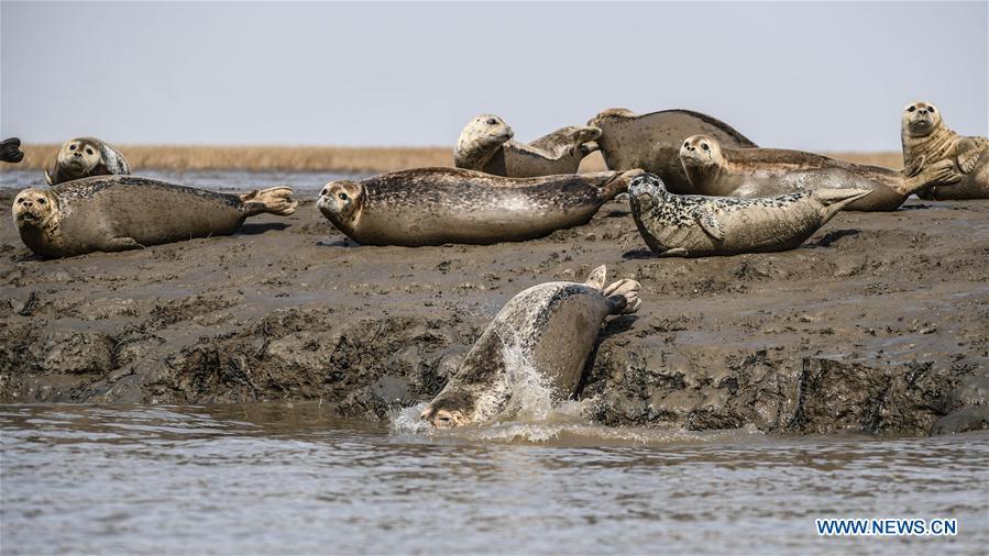 Spotted seals are seen on the coastal mudflat of Sandaogou in Panjin, northeast China's Liaoning Province, March 28, 2019. Over 120 spotted seals rest here and will head back to the Pacific regions in late May. (Xinhua/Pan Yulong)