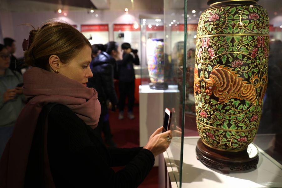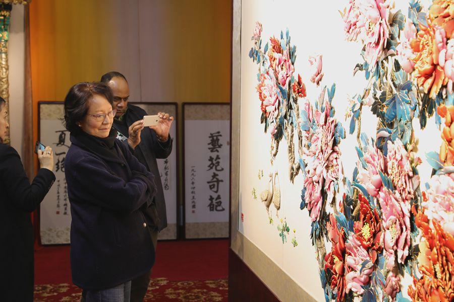 Suzzanne Ogge, UNESCO facilitator for intangible cultural heritage, takes a photo of delicate cloth paste painted patterns on a vase on March 27, 2019, in Fengning Manchu autonomous county, Hebei province.(Photo by Fu Rui/chinadaily.com.cn)