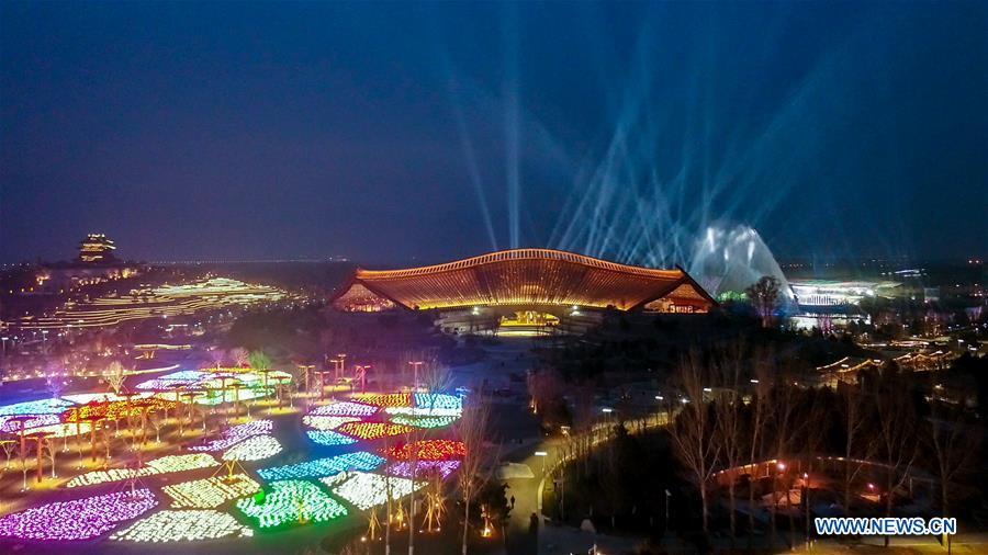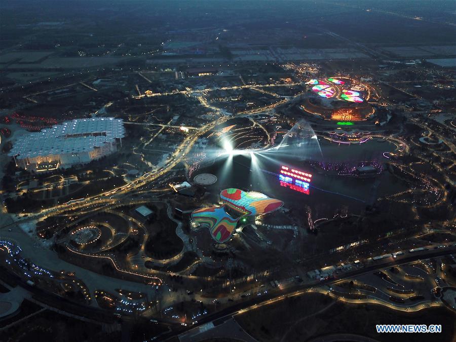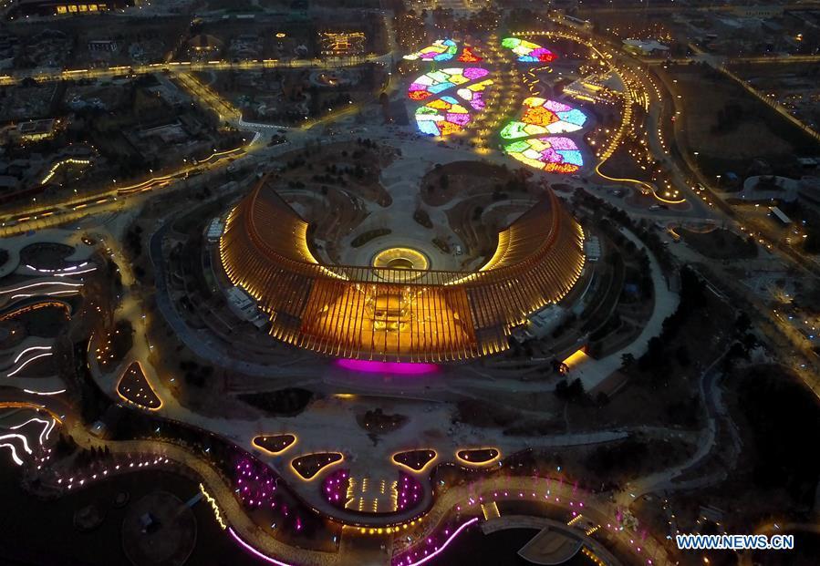 Aerial photo taken on March 26, 2019 shows the night view at the site of the International Horticultural Exhibition 2019 Beijing China (Expo 2019 Beijing) in Yanqing District of Beijing, capital of China. The 2019 Beijing International Horticultural Exhibition is slated to kick off on April 29, 2019. (Xinhua/Ju Huanzong)