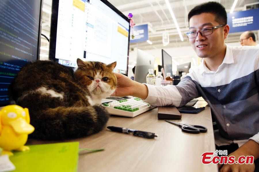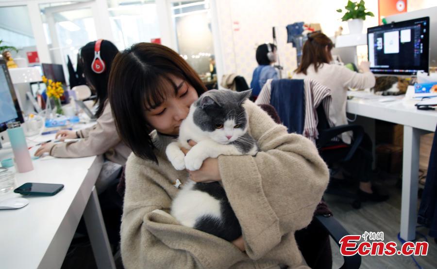 An employee cuddles a pet cat in the offices of a company in Shanghai, March 29, 2019. The company has allowed employees to bring their cats or dogs to the office for its internal Pet Day as a way to reduce work stress. (Photo: China News Service/Tang Yanjun)