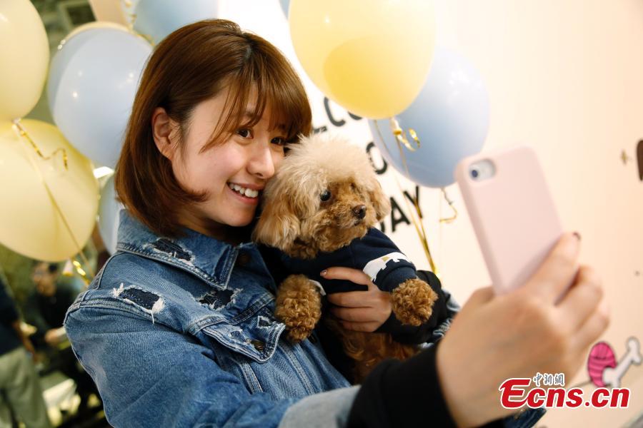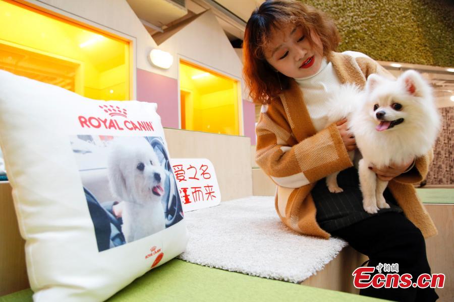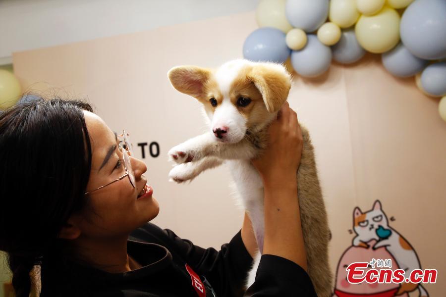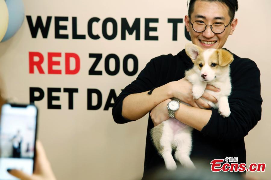 An employee cuddles a pet dog in the offices of a company in Shanghai, March 29, 2019. The company has allowed employees to bring their cats or dogs to the office for its internal Pet Day as a way to reduce work stress. (Photo: China News Service/Tang Yanjun)