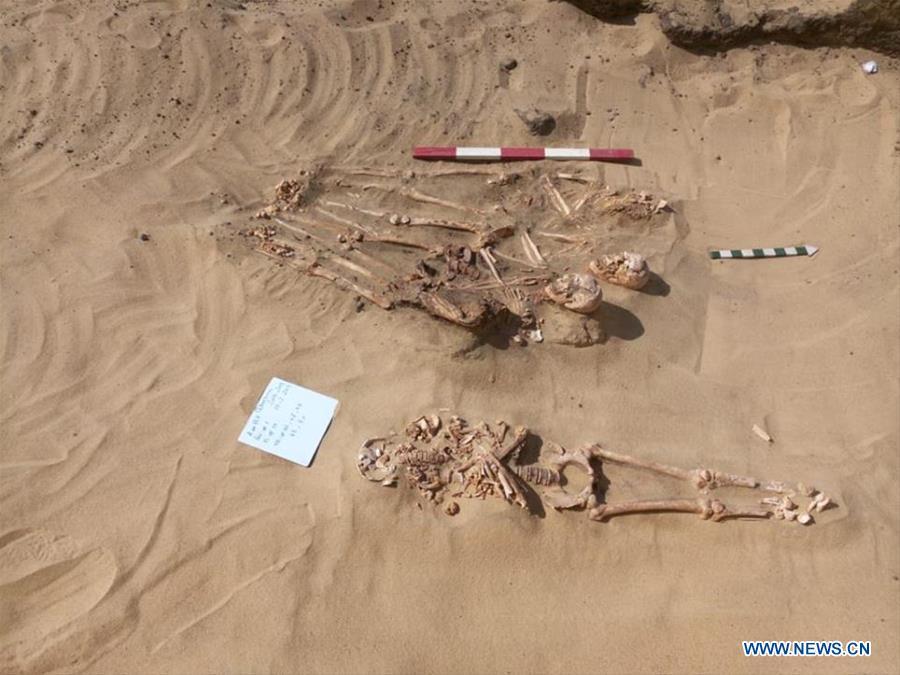 The undated photo provided by Egyptian Ministry of Antiquities on April 1, 2019 shows mummies uncovered in Quesna city of Menoufia province, Egypt. An Egyptian archaeological mission uncovered a limestone-made coffin in Quesna city of Menouifia province, the country's Ministry of Antiquities said in a statement on Monday. "Two mummies were found inside the two-meter-long and 60-centimeter-wide coffin, but in bad conditions," said Mostafa Waziri, secretary general of Egypt's Supreme Council of Antiquities (SCA), in the statement. Other golden plates, bronze coins and three small statues were discovered near the coffin. (Xinhua)