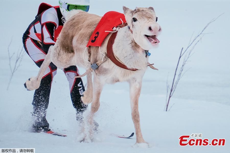 Reindeers and their jockeys are seen as they approach the finish line on the 1 km ice track of the final in the BRP Poro cup reindeer race on a lake in Inari, northern Finland, March 31, 2019. The competition is a six-stage championship run in the north of Finland during the winter months since 1950. Competitors race on skis pulled by a reindeer on a 1000 meter u-shaped track on the snow. (Photo/Agencies)