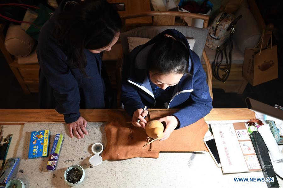 Ruan Xiyue, the fourth generation artist of Carved Gourd Ruan, teaches her students at Lanzhou Vocational Technical College in Lanzhou, northwest China's Gansu Province, April 1, 2019. A carved gourd, as the name suggests, is a gourd carved with landscapes, portraits, animals, calligraphy or poems, and then painted with ink. The process of gourd carving includes choosing gourd, painting, engraving and coloring. It was inscribed in the first group of provincial intangible cultural heritages of Gansu in 2006. (Xinhua/Fan Peishen)