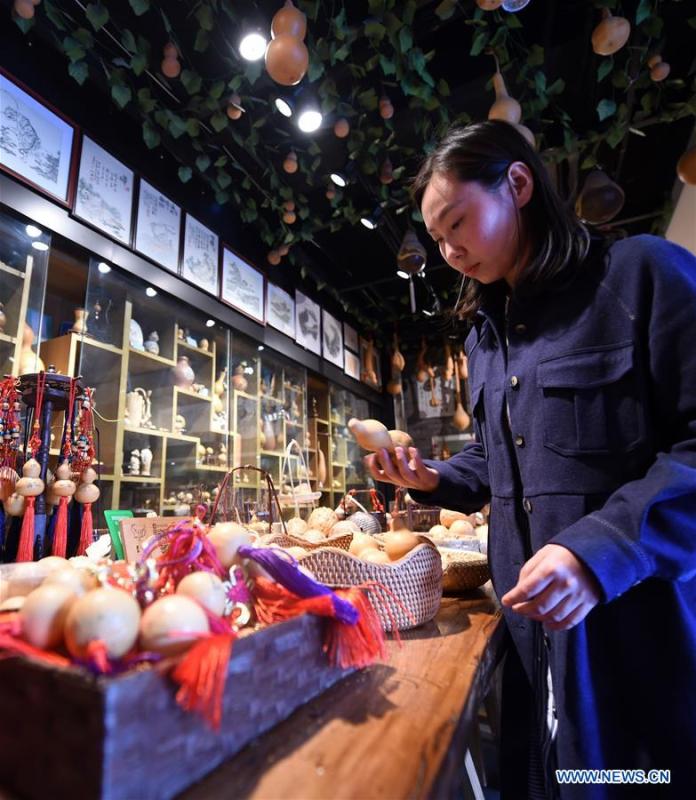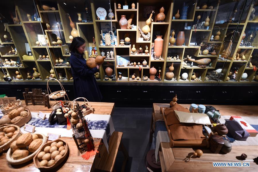 Ruan Xiyue, the fourth generation artist of Carved Gourd Ruan, arranges the handicrafts at a gourd carving studio in Lanzhou, northwest China's Gansu Province, April 1, 2019. A carved gourd, as the name suggests, is a gourd carved with landscapes, portraits, animals, calligraphy or poems, and then painted with ink. The process of gourd carving includes choosing gourd, painting, engraving and coloring. It was inscribed in the first group of provincial intangible cultural heritages of Gansu in 2006. (Xinhua/Fan Peishen)