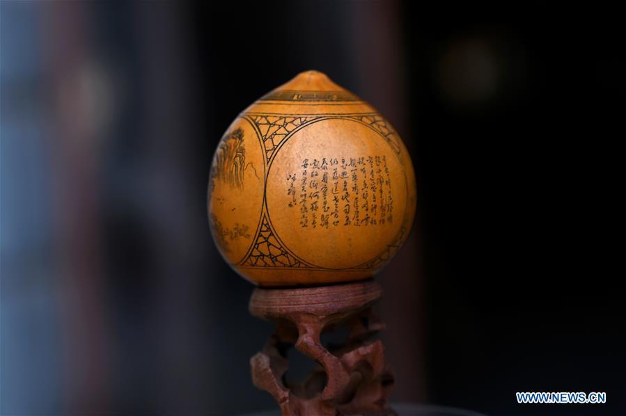Photo taken on March 31, 2019 shows a carved gourd, created by Ruan Wenhui, a master of Chinese arts and crafts, at a gourd carving studio in Lanzhou, northwest China's Gansu Province. A carved gourd, as the name suggests, is a gourd carved with landscapes, portraits, animals, calligraphy or poems, and then painted with ink. The process of gourd carving includes choosing gourd, painting, engraving and coloring. It was insciribed in the first group of provincial intangible cultural heritages of Gansu in 2006. (Xinhua/Liu Jie)