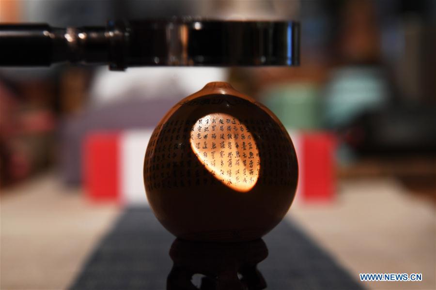 Photo taken on April 1, 2019 shows a part of a carved gourd named "Heart Sutra", created by Ruan Lin, an arts and crafts master of Gansu Province, at a gourd carving studio in Lanzhou, northwest China's Gansu Province. A carved gourd, as the name suggests, is a gourd carved with landscapes, portraits, animals, calligraphy or poems, and then painted with ink. The process of gourd carving includes choosing gourd, painting, engraving and coloring. It was inscribed in the first group of provincial intangible cultural heritages of Gansu in 2006. (Xinhua/Fan Peishen)