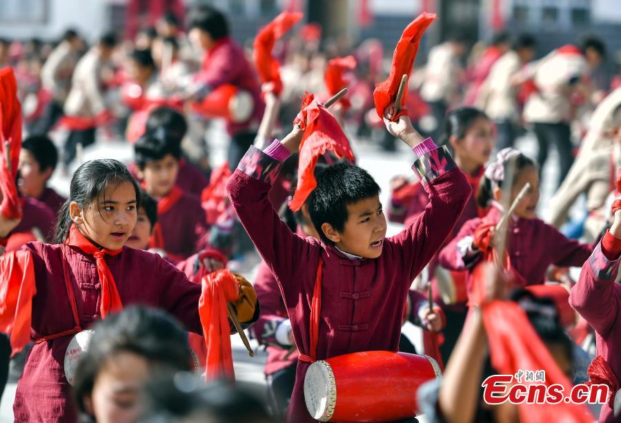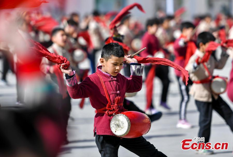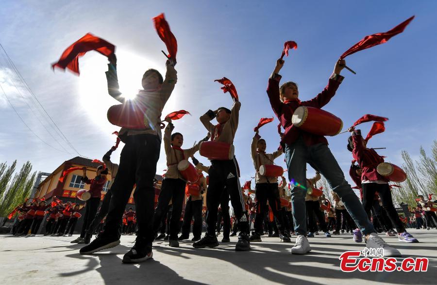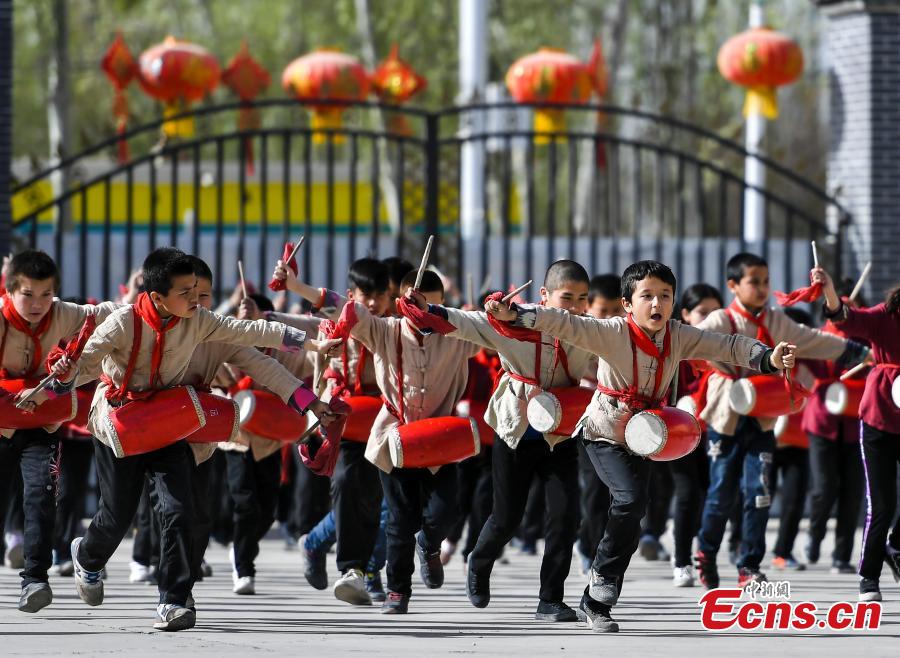 Photo shows students from a primary school in Wushi County, in northwest China's Xinjiang Uygur Autonomous Region learning waist drum, April 8, 2019. (Photo/China News Service)