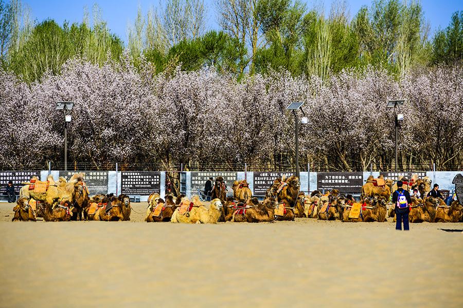 Clear weather and apricot blossoms bring increasing visitors to the Crescent Lake scenic spot (Yueya Quan) in Dunhuang, Northwestern China's Gansu Province.(Photo/chinadaily.com.cn)