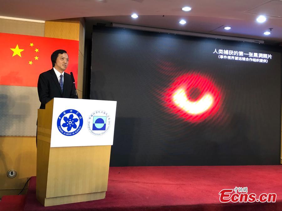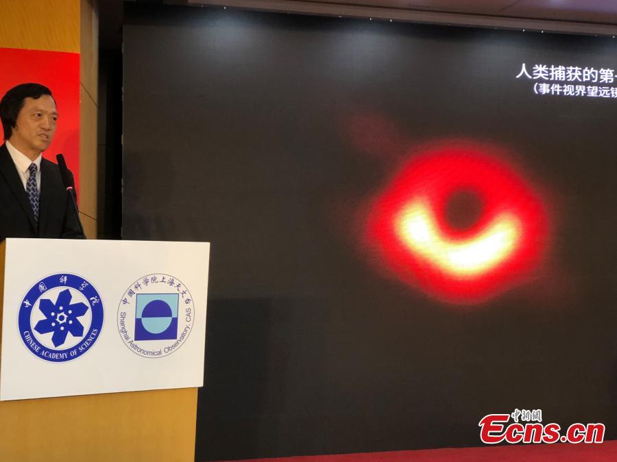 Shen Zhiqiang, head of Shanghai Astronomical Observatory (SAO), presides over a press conference to release the first-ever image of a supermassive black hole at the heart of the distant galaxy M87, in east China's Shanghai, April 10, 2019.The image of the black hole, based on observations through the Event Horizon Telescope (EHT), a planet-scale array of eight ground-based radio telescopes forged through international collaboration, was unveiled in coordinated press conferences across the globe at around 9:00 p.m. (Beijing time) on Wednesday. The landmark result offers scientists a new way to study the most extreme objects in the universe predicted by Albert Einstein's general relativity. (Photo: China News Service/Sun Zifa)