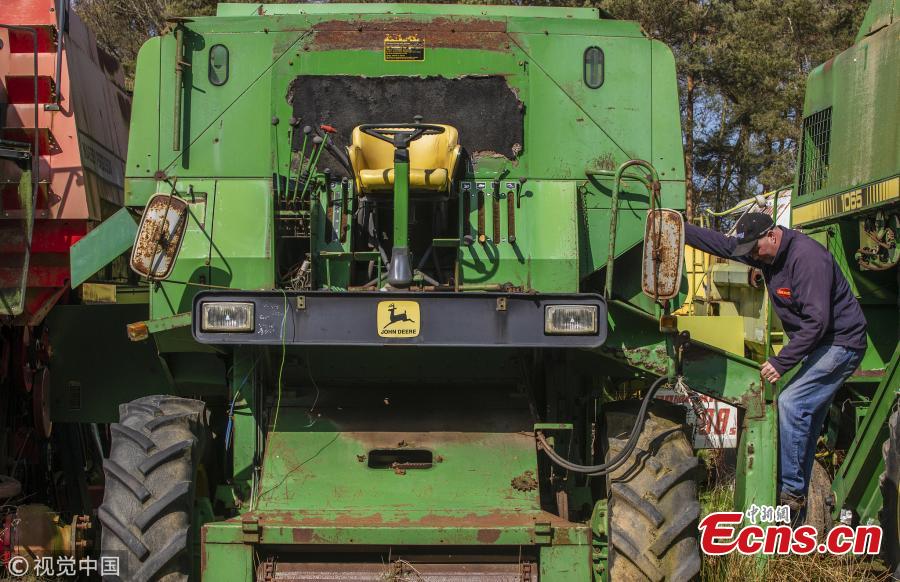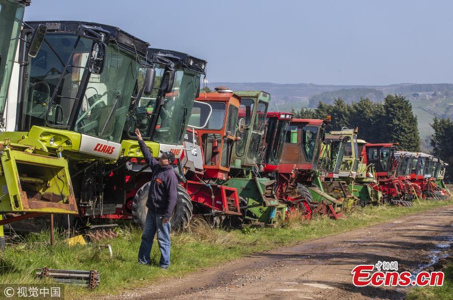 Richard Manners, parts specialist looks over some of the combines. 350 dead combines sit in a field, are broken for parts and exported around the world in a container, where they are welded back together on arrival. April 6 2019. (Photo/VCG)