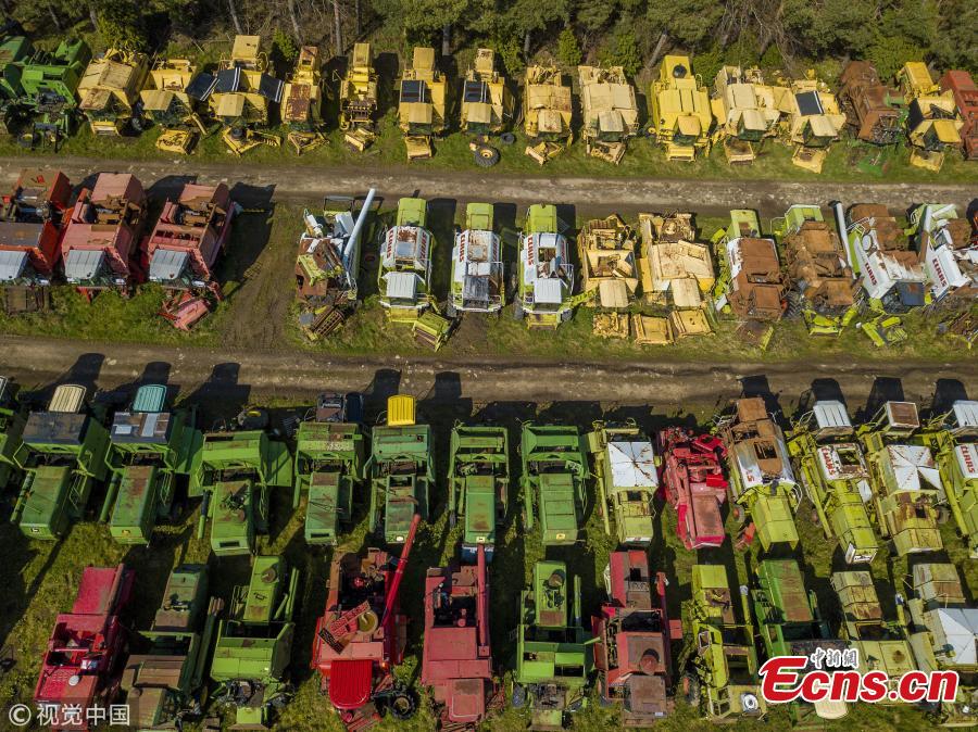 350 dead combines sit in a field, are broken for parts and exported around the world in a container, where they are welded back together on arrival. April 6 2019. (Photo/VCG)