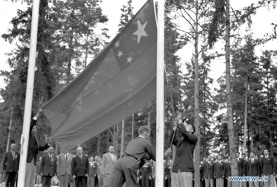 File photo taken on July 29, 1952 shows that a member of Chinese delegation hoisting the national flag in the Helsinki Olympic Athlete's Village. The 15th Summer Olympic Games took place in Helsinki, capital of Finland, from July 19 to August 3, 1952. The newly founded People's Republic of China sended a 40-member-delegation to the Games. From sending athletes to Helsinki Summer Olympic Games for the very first time in 1952 to winning the bid to host 2022 Winter Olympic Games in 2015, the People's Republic of China went through a remarkable history of sports, including successfully hosting the 2008 Summer Olympic Games and preparing for the upcoming 2022 Winter Olympic Games. (Xinhua)