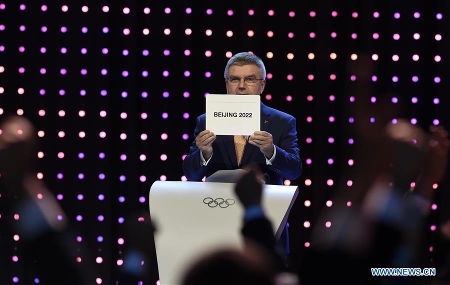 File photo taken on July 31, 2015 shows International Olympic Committee (IOC) president Thomas Bach shows the card with the name Beijing as the winning name of the 2022 Winter Olympic bid city, during the 128th International Olympic Committee (IOC) session in Kuala Lumpur, Malaysia. From sending athletes to Helsinki Summer Olympic Games for the very first time in 1952 to winning the bid to host 2022 Winter Olympic Games in 2015, the People's Republic of China went through a remarkable history of sports, including successfully hosting the 2008 Summer Olympic Games and preparing for the upcoming 2022 Winter Olympic Games. (Xinhua/Gong Lei)