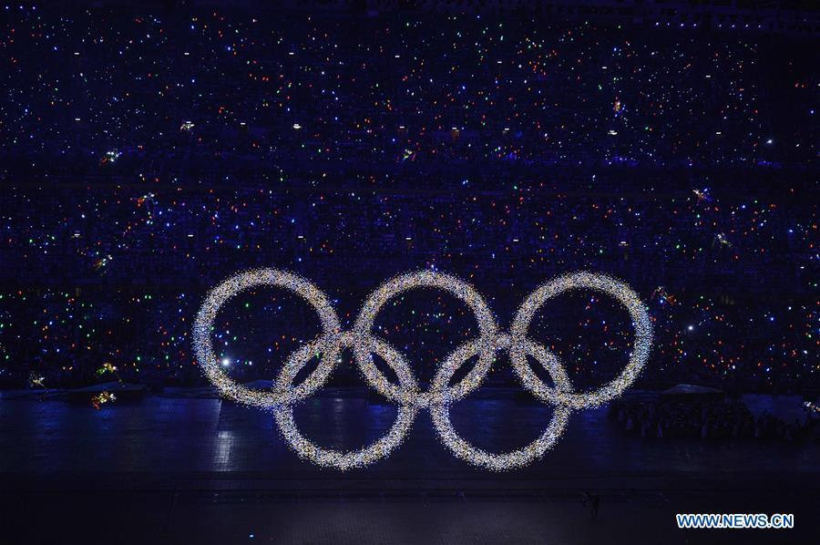 Photo taken on Aug. 8, 2008 shows the fireworks in the shape of Olympic rings during the opening ceremony of the Beijing Olympic Games held in the National Stadium, also known as the Bird's Nest, in north Beijing, China. From sending athletes to Helsinki Summer Olympic Games for the very first time in 1952 to winning the bid to host 2022 Winter Olympic Games in 2015, the People's Republic of China went through a remarkable history of sports, including successfully hosting the 2008 Summer Olympic Games and preparing for the upcoming 2022 Winter Olympic Games. (Xinhua/Ma Zhancheng)