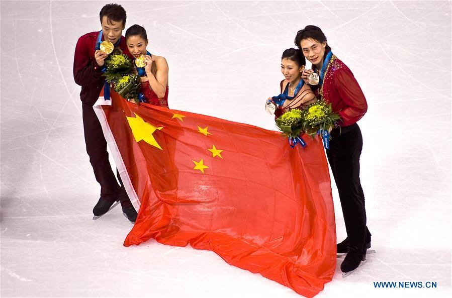 File photo taken on Feb. 15, 2010 shows gold medalists Shen Xue (2nd L) and Zhao Hongbo (1st L) of China, compatriots and silver medalists Pang Qing (2nd R) and Tong Jian pose with the Chinese national flag during the medals ceremony for the figure skating pairs event at the 2010 Winter Olympics at the Pacific Coliseum in Vancouver, Canada. Shen Xue/Zhao Hongbo won the China's first Olympic gold medal in figure skating. From sending athletes to Helsinki Summer Olympic Games for the very first time in 1952 to winning the bid to host 2022 Winter Olympic Games in 2015, the People's Republic of China went through a remarkable history of sports, including successfully hosting the 2008 Summer Olympic Games and preparing for the upcoming 2022 Winter Olympic Games. (Xinhua/Chen Xiaowei)