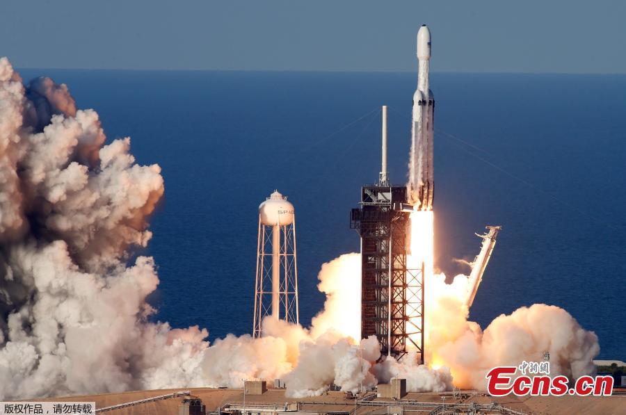 A SpaceX Falcon Heavy rocket, carrying the Arabsat 6A communications satellite, lifts off from the Kennedy Space Center in Cape Canaveral, Florida, on April 11, 2019. (Photo/Agencies)