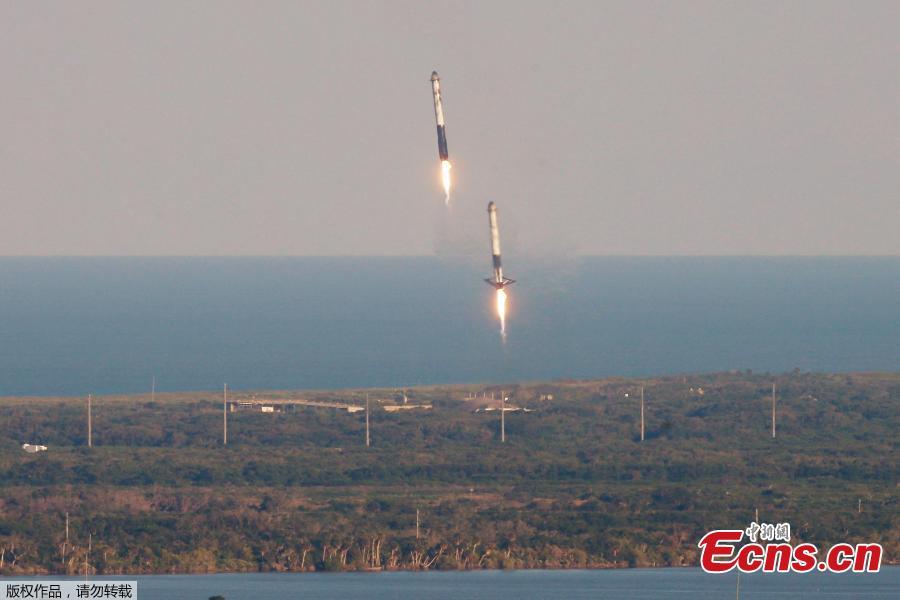 The two side boosters of SpaceX's Falcon Heavy rocket land on the company's pads in Florida, April 11, 2019. (Photo/Agencies)