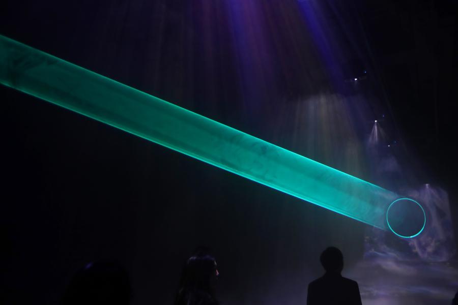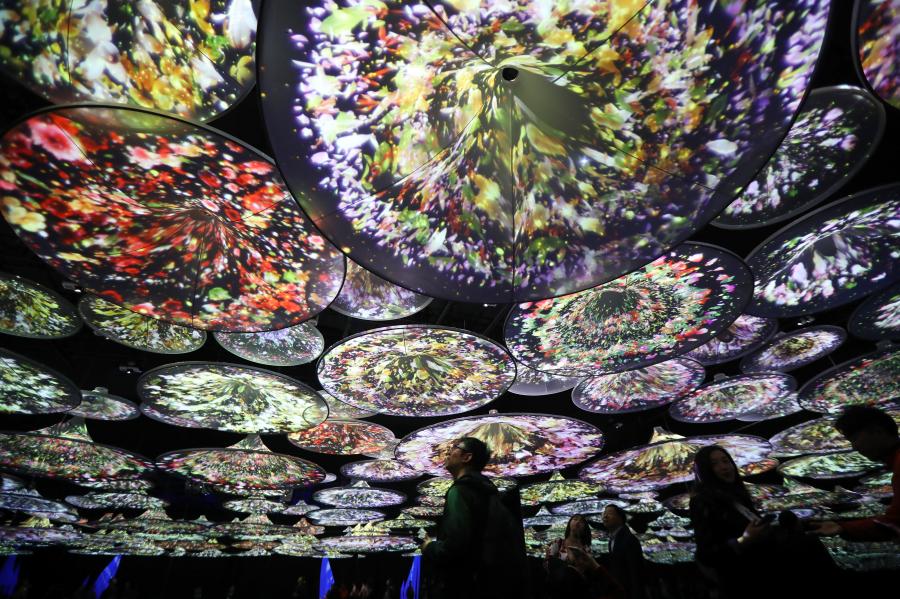 An interactive art installation project that draws inspiration from three famous paintings in Chinese history opens at a gallery in Deji Plaza, an upscale office and shopping mall complex in Nanjing, Jiangsu Province, April 11, 2019. Visitors appear to immerse themselves into scenes in the paintings. The three scrolls included "A Thousand Miles of Rivers and Mountains", by Wang Ximeng (1096?1119), and "The Goddess of River Luo", by Gu Kaizhi's (c.344- c.406). (Photo: China News Service/Yang Bo)