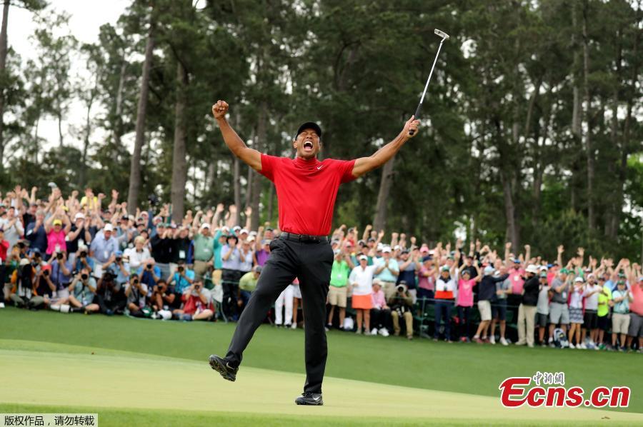 The patrons roar as Tiger Woods sinks his par putt to win the Masters at Augusta National Golf Club in Augusta, Georgia, on April 14, 2019. (Photo/Agencies)