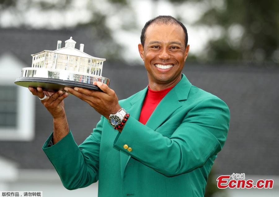 Tiger Woods celebrates with his fifth green jacket after winning the 2019 Masters Tournament at the Augusta National Golf Club in Augusta, Georgia, on April 14, 2019. (Photo/Agencies)