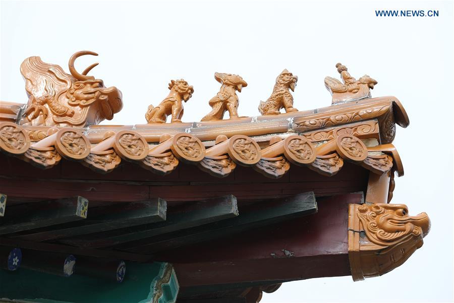 Photo taken on April 18, 2019 shows sculptures at the Encho-en garden in Tottori, Japan. Covering an area of about 10,000 square meters, Encho-en is one of the biggest full-scaled Chinese-style garden in Japan. It was built in 1995 to show the friendship between Tottori and north China's Hebei Province. The designing and materials procurement and processing took place in China. The main building was shop-assembled in China before the final assembly in Japan. All these steps were supervised by Chinese engineers. (Xinhua/Du Xiaoyi)