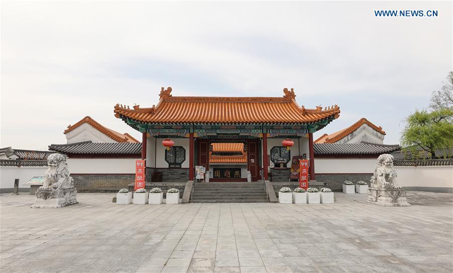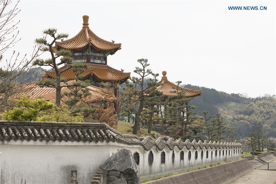 Photo taken on April 18, 2019 shows the entrance of the Encho-en garden in Tottori, Japan. Covering an area of about 10,000 square meters, Encho-en is one of the biggest full-scaled Chinese-style garden in Japan. It was built in 1995 to show the friendship between Tottori and north China's Hebei Province. The designing and materials procurement and processing took place in China. The main building was shop-assembled in China before the final assembly in Japan. All these steps were supervised by Chinese engineers. (Xinhua/Du Xiaoyi)