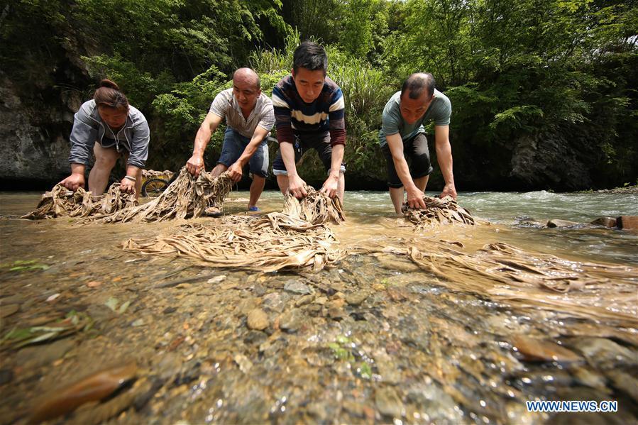 Craftsmen wash raw materials in a river in Shiqiao Village of Danzhai County, southwest China's Guizhou Province, April 24, 2019. Wang Xingwu, 53, a national intangible cultural heritage inheritor in papermaking, learned the papermaking technique from his family as a child. Besides exerting the old papermaking technique to its full potential, Wang keeps raising product quality and improving the making procedure. With the involvement of plants in the papermaking process, he has created more than 160 kinds of patterned papers and paper crafts. He also develops a kind of handmade white paper more suitable for writing calligraphy and painting. (Xinhua/Huang Xiaohai)