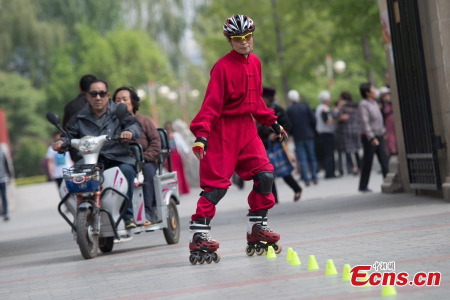 Xiao xuerong, 68, draws a crowd as she practices roller skating in Xuefu Park in Taiyuan, Shanxi Province, April 26, 2019. (Photo/China News Service)