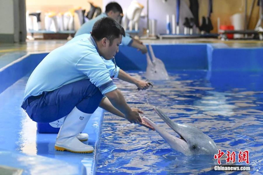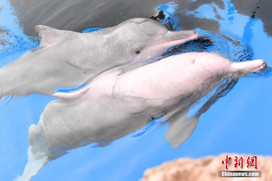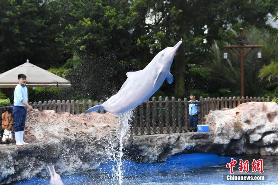 Chinese white dolphins playing and performing during an event at the Chimelong Ocean Kingdom in Zhuhai, Guangdong Province, in a photo taken on Saturday, April 27, 2019. Hailed as "mermaids" and "giant pandas in the sea," the Chinese white dolphins often appear in the East China Sea, and are guarded under first-class state protection in China. The event is part of an annual conservation campaign aimed at raising awareness about this endangered species hosted by Chinese authorities. (Photo/China News Service)