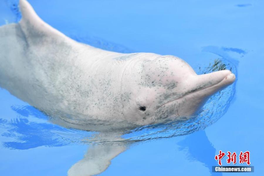 A Chinese white dolphin playing and performing during an event at the Chimelong Ocean Kingdom in Zhuhai, Guangdong Province, in a photo taken on Saturday, April 27, 2019. Hailed as "mermaids" and "giant pandas in the sea," the Chinese white dolphins often appear in the East China Sea, and are guarded under first-class state protection in China. The event is part of an annual conservation campaign aimed at raising awareness about this endangered species hosted by Chinese authorities. (Photo/China News Service)