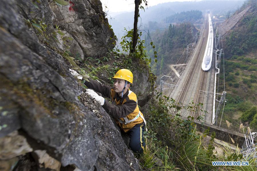Zhang Yi, a bridge and tunnel worker born in the 1990s, is seen at an observation point while a bullet train runs on the railway in Yichang, central China's Hubei province, Jan. 19, 2017. Zhang checks the mountain rock day and night to ensure safety of the Yichang-Wanzhou railway line during the Spring Festival travel rush. A nation will prosper only when its young people thrive; a country will be full of hope and have a great tomorrow only when its younger generations have ideals, ability, and a strong sense of responsibility. Young people always play a vanguard role in realizing national rejuvenation, which is the mission of the Chinese youth in the new era. In China many young people realize the value of life through hard work. They are writing a brilliant chapter worthy of our times in their efforts to take advantage of their youthful vigor, explore life and contribute to society. (Xinhua/Xiong Qi)