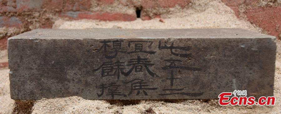 A brick displaying Chinese characters was found during the excavation of a tomb from the late Han Dynasty (206 BC?220 AD) in Xi'an City, Northwest China's Shaanxi Province. Zhu Lianhua, the deputy director of the Xi'an Cultural Relics and Archaeology Research Institute, said despite sand being filled around the tomb to protect it, raiders had struck at the site many times. (Photo provided by the Xi'an Cultural Relics and Archaeology Research Institute)