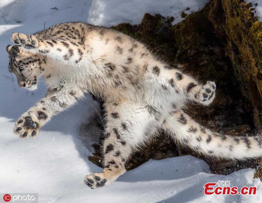 Photographer Ron Conigilaro, 47, from Detroit, Michigan, captures the charming moment a snow leopard does the 'jazz hands' during a visit to Glacier National Park. The leopard, named Mystique, is part of a breeding program to ensure the healthy management of the species. (Photo/IC)