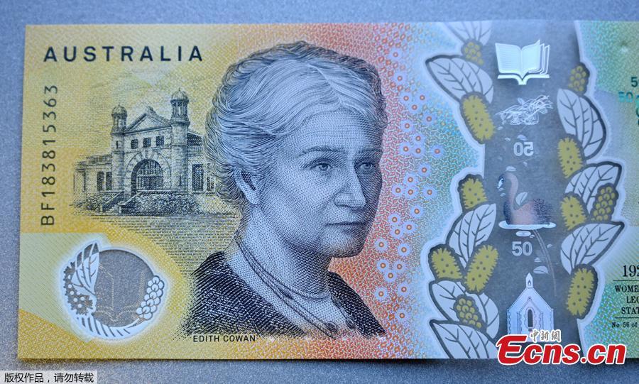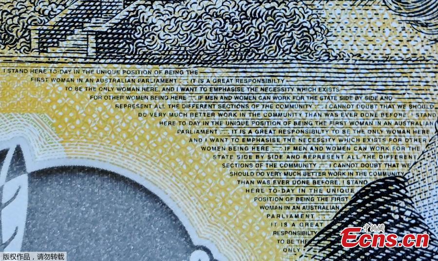 This photo illustration shows the detail in Australia's state-of-the-art new 50 dollar banknote in Sydney on May 9, 2019, with a spelling mistake in the microprint of a speech by Australia's first woman parliamentarian Edith Cowan. The yellow and green note came into circulation last October, but it took seven months for the public to notice "responsibility" was repeatedly misspelt in the text of Cowen's maiden speech to Australia's parliament in July 1921. (Photo/Agencies)