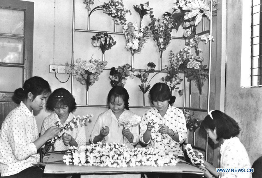 Undated file photo shows workers making silk flowers at a factory in Shatoujiao Township of Shenzhen, south China's Guangdong Province. The Chung Ying Street (Chung Ying means China and Britain), linking Shenzhen of Guangdong Province and Hong Kong in south China, has once again set sail in the development of the Guangdong-Hong Kong-Macao Greater Bay Area and embarked on a new journey towards high-quality development. (Xinhua/Yang Zhenhe)