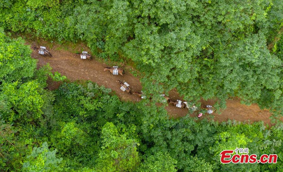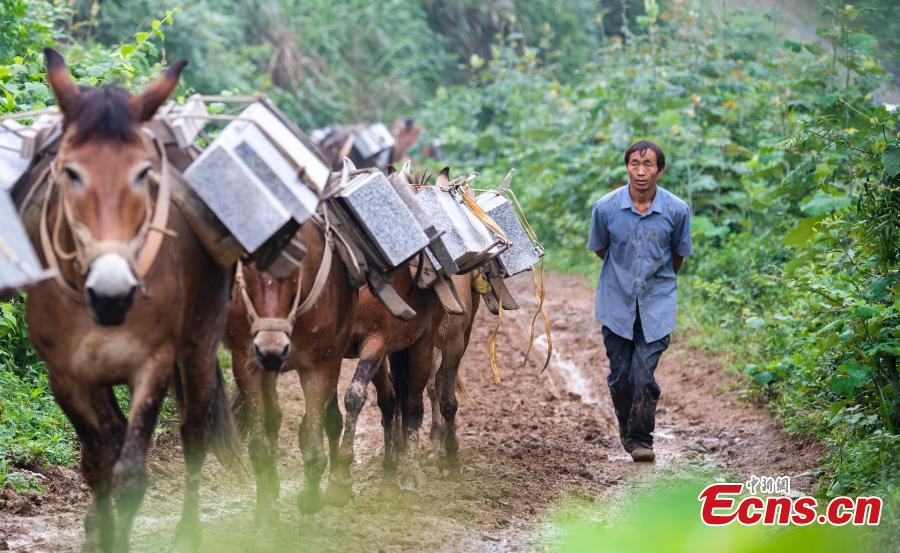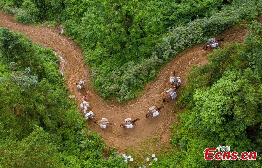 A caravan, consisting of over 20 mules and horses, transports construction materials to build a 4.2-kilometer footpath on a mountain in Xinyu City, East China’s Jiangxi Province, May 21, 2019. Led by Wang Lianpin, the caravan has helped in construction of footpaths in tourist attractions and electricity projects in areas inaccessible by vehicles for ten years. Wang’s team now includes 13 members. (Photo: China News Service/Zhao Chunliang)