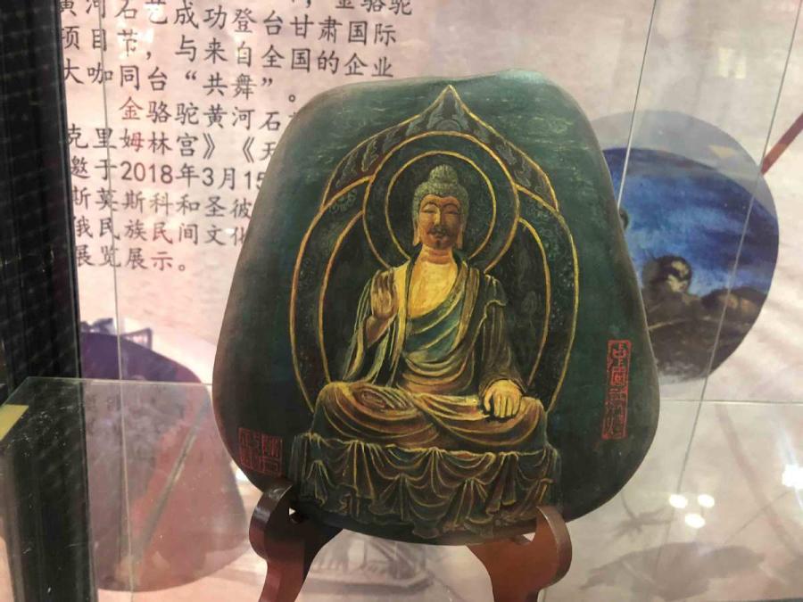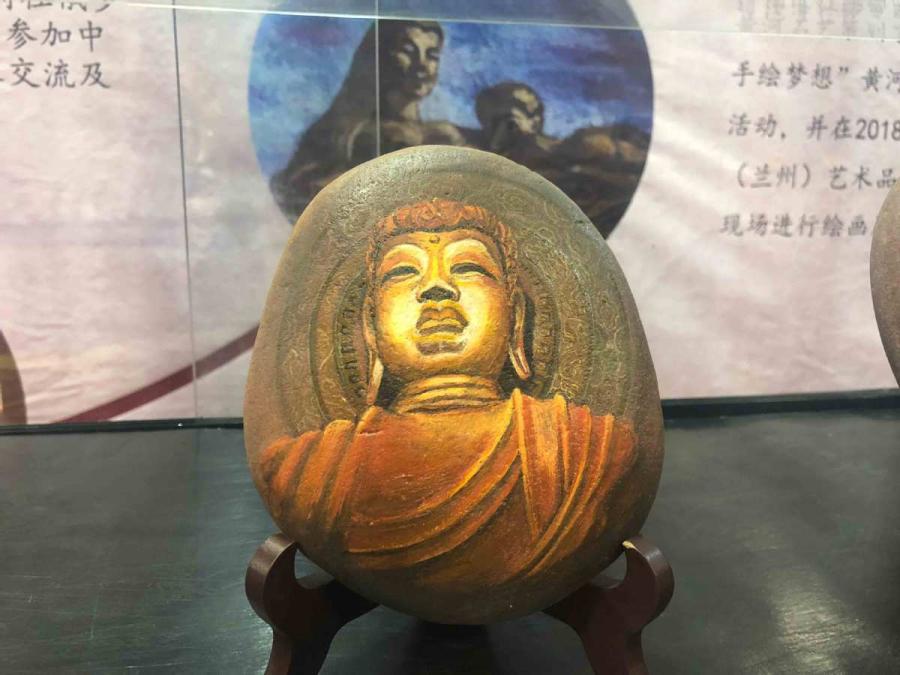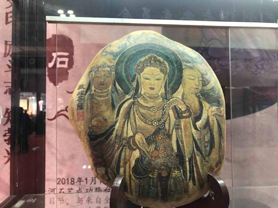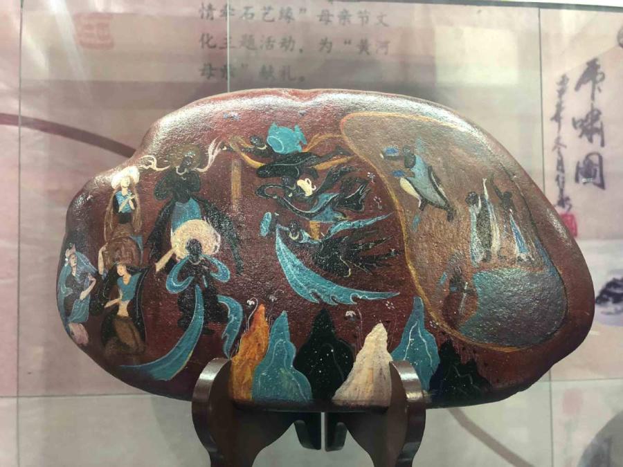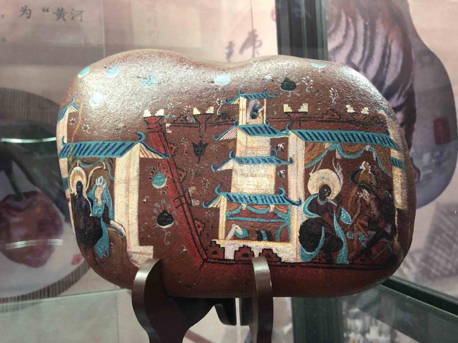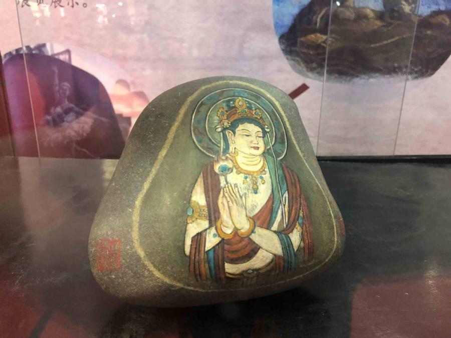 The 58-year-old folk artist has now painted on these special stones his own reproductions of many historical paintings and frescoes found in the Mogao Grottoes of Dunhuang, where large numbers of Buddhist frescos have survived for more than 1,000 years.