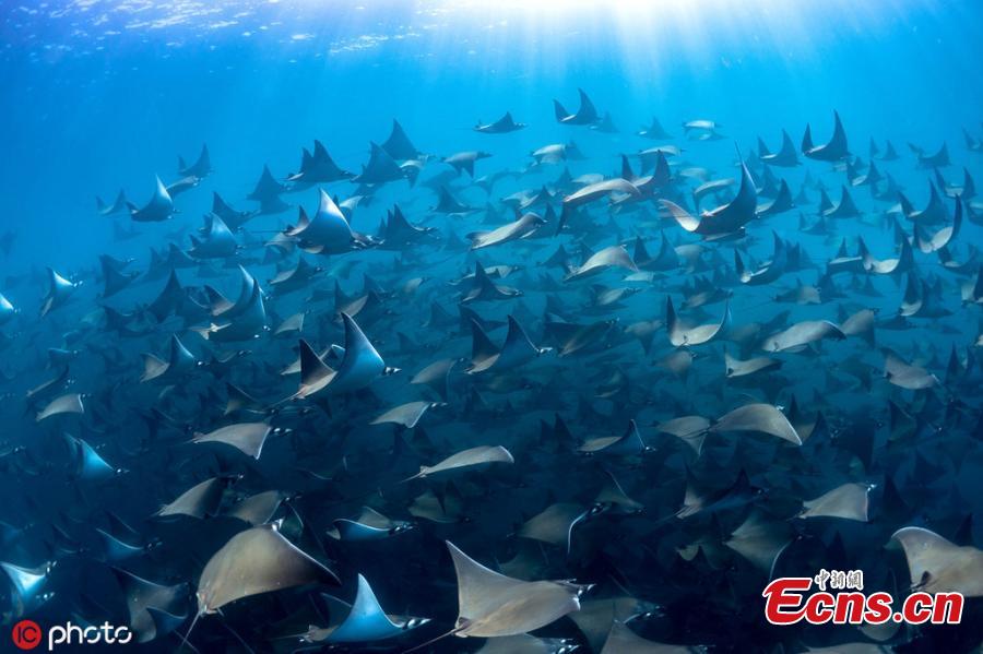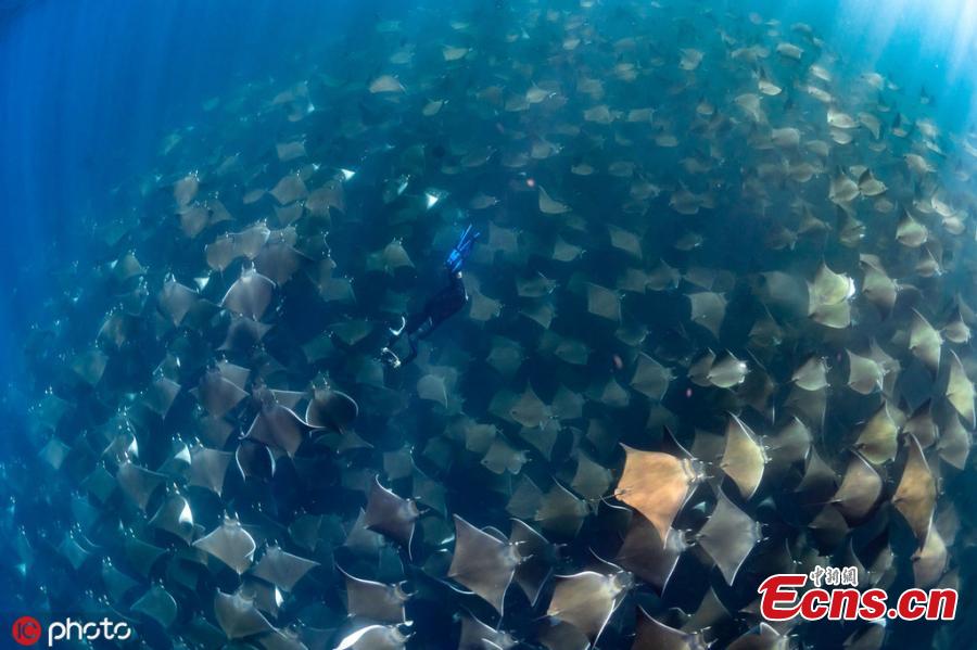 Dive instructor Jay Clue was lucky to find one of the largest-ever schools of manta rays migrating off the coast of Baja California Sur, Mexico. The harmless rays allowed divers to swim above them. (Photo/ICphoto)