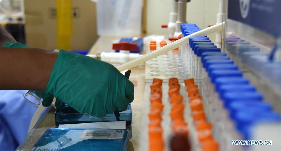 Researchers deal with samples of sea water on China's research vessel KEXUE(Science) in the western Pacific Ocean, May 29, 2019. KEXUE is carrying out a 20-day long investigation over a series of seamounts in the south of the Mariana Trench in the western Pacific Ocean. They will focus on biological diversities, ecological systems and biological distributions of the seamounts that they planned to explore. (Xinhua/Zhang Xudong)