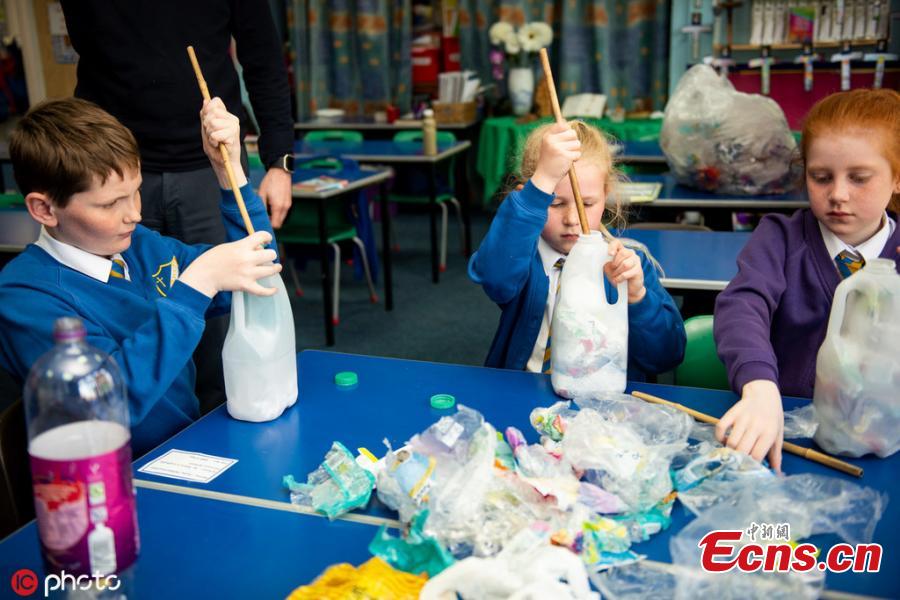 Kids at St Mary's RC Primary School enjoy a lesson in their recently built eco classroom made out of plastic bottles filled with plastic waste, also known as 'eco bricks' in Lancashire, UK. These schoolkids have built their own CLASSROOM out of 3,000 plastic bottles. Pupils at St Mary’s RC Primary School in Accrington, Lancashire, turned two tonnes of recycled plastic into ‘eco bricks’ to build the environmentally friendly area. (Photo/IC)