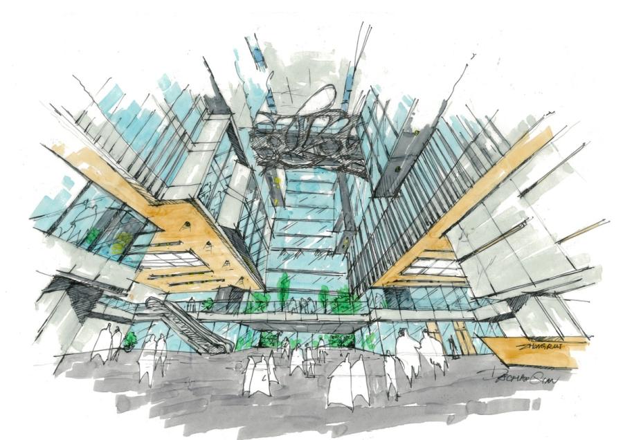 A design drawing shows the interior of Zhengzhou Zhongrui Headquarter, a financial office building in Zhengdong New District in Zhengzhou, Central China's Henan Province.(Photo provided to chinadaily.com.cn)