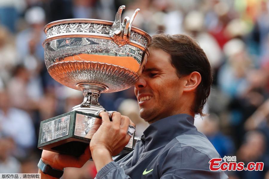 Rafael Nadal of Spain competes during the men's singles final with Dominic Thiem of Austria at French Open tennis tournament 2019 at Roland Garros, in Paris, France on June 9, 2019. (Xinhua/Han Yan)