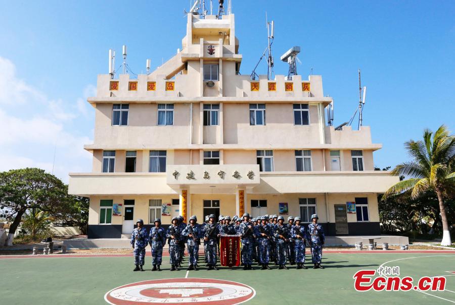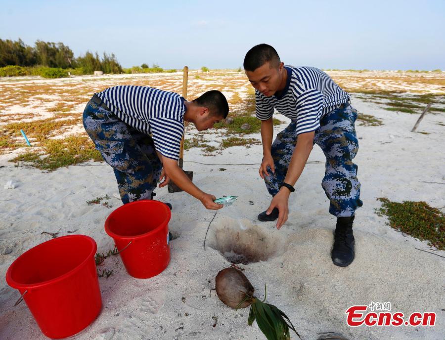 PLA Navy soldiers work on Zhongjian Island of Xisha Islands in South China Sea, Hainan Province. Over dozens of years, soldiers have transformed the barren site into a lush area despite the harsh environment of high temperatures, high humidity, high salt and lack of fresh water. (Photo: China News Service/Wang Xiaobin)