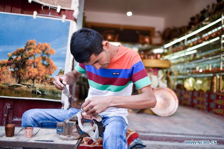 A craftsman works on a bronze ware in the ancient city of Kashgar, northwest China's Xinjiang Uygur Autonomous Region, June 12, 2019. The ancient city of Kashgar has been well prepared for the peak tourism season through multiple measures including improving infrastructure and service quality as well as staging acrobatics performances to help tourists better experience the time-honored folk culture here. (Xinhua/Zhao Ge)