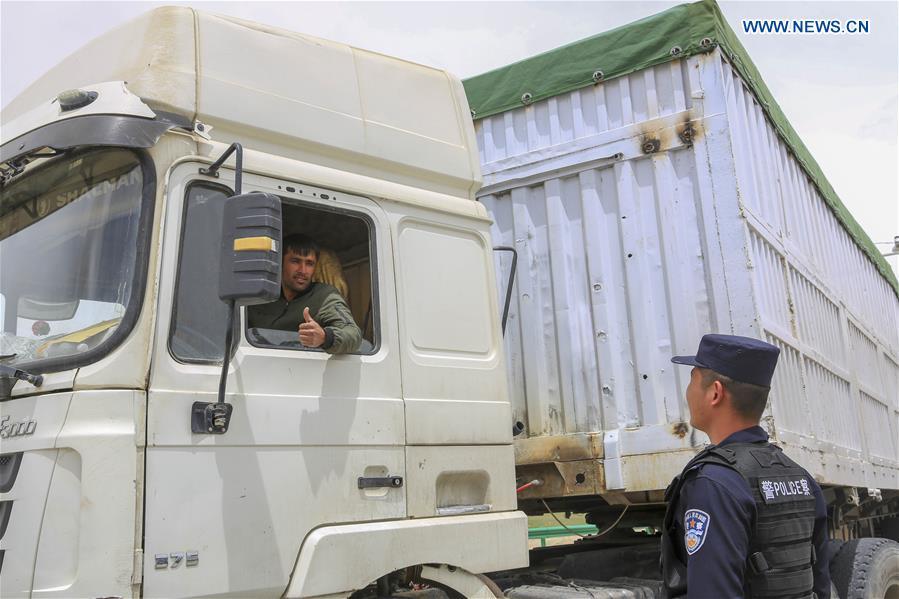 Chinese border policemen check vehicles ready to pass the Karasu port in Tajik Autonomous County of Taxkorgan, northwest China's Xinjiang Uygur Autonomous Region, on June 11, 2019. With the Belt and Road Initiative, trade between China and Tajikistan has continued to develop. The Karasu port between the two countries has seen large quantities of goods cleared by customs every year. (Xinhua/Huang Huan)