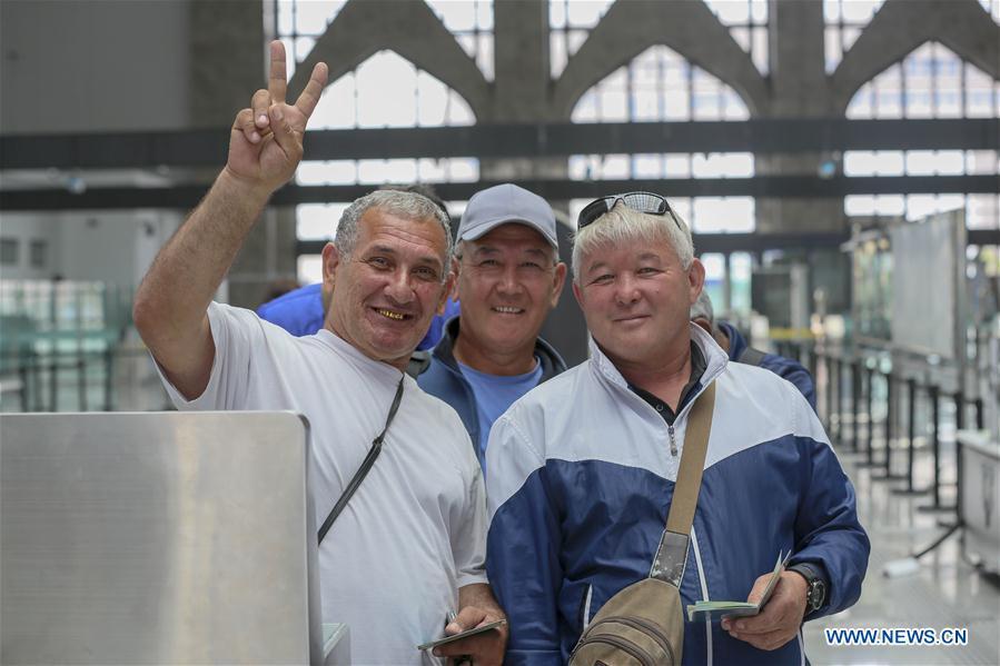Passengers from Tajikistan pose for a group photo in Karasu port, northwest China's Xinjiang Uygur Autonomous Region, June 11, 2019. With the Belt and Road Initiative, the trade between Xinjiang, Kyrgyzstan and Tajikistan has continued to develop. On the southern border of Xinjiang, three ports, Turugart, Erkeshtam and Karasu, between China and Kyrgyzstan and Tajikistan, saw large quantities of goods cleared by customs every year. (Xinhua/Huang Huan)